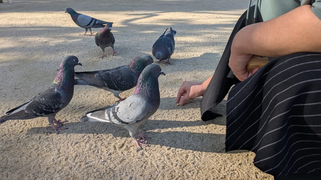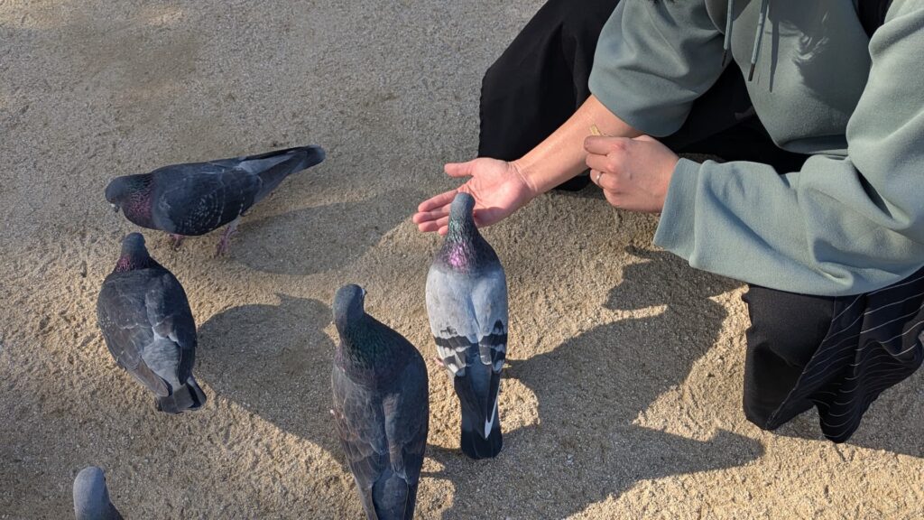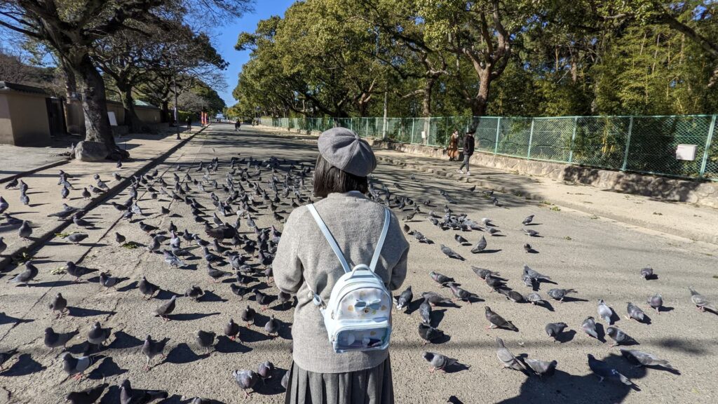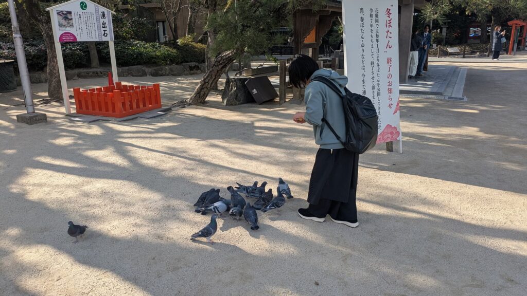 筥崎宮に来ると毎回している恒例行事、鳩使いごっこ。2022年の初詣で大量の鳩に囲まれたら病みつきになったようです。