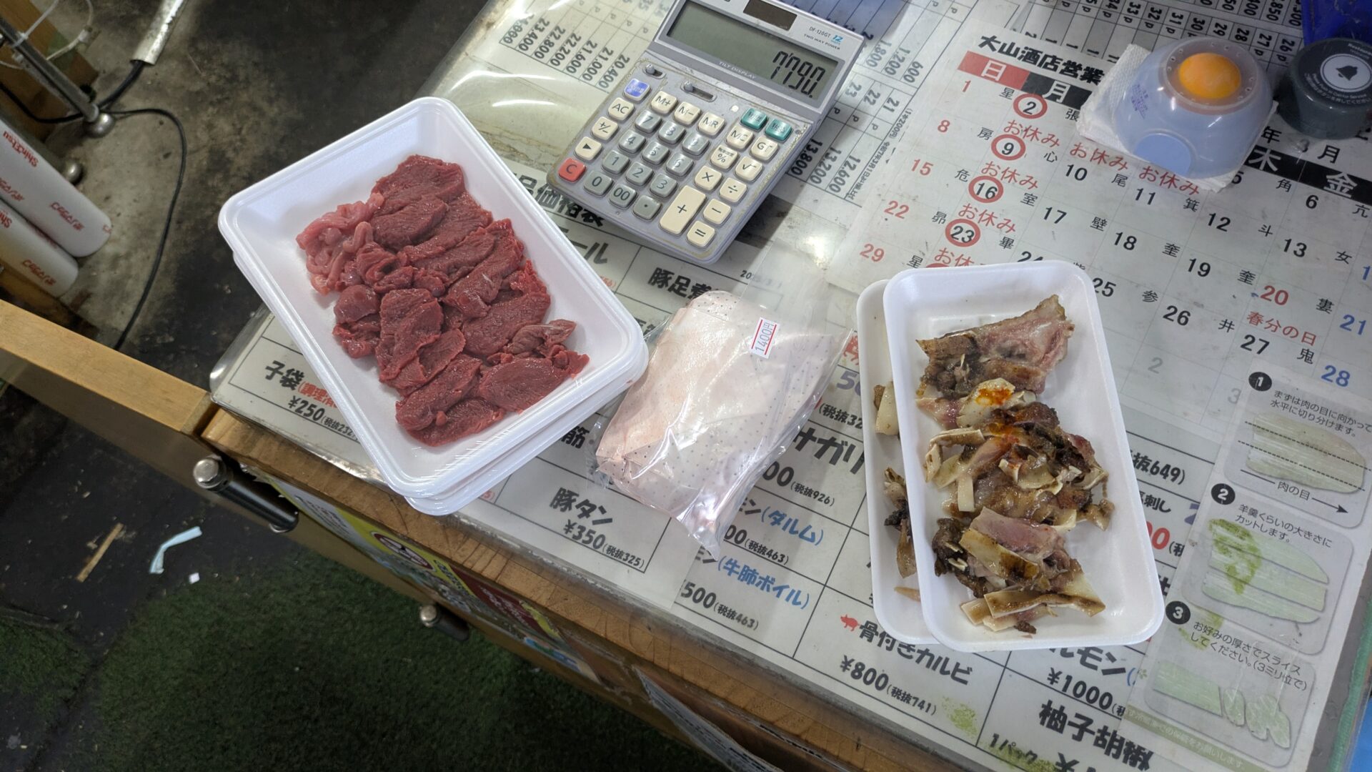 いすゞ勤務最終日に先輩が連れて行ってくれた知る人ぞ知る地元の商店。豚足やミミガー、喉軟骨などなど酒飲みにはありがたすぎるラインナップ、そして店舗奥にある大型冷蔵庫にところ狭しと並べられているのは赤身の馬刺し。スライスされているのもあるしブロックもあるし。