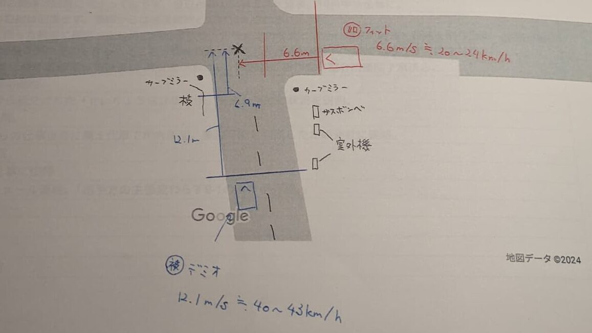 現場検証のプロなんかじゃないから、この結果がどれだけ信ぴょう性を持つのかは不確かですが、少なくともこの交差点において適切な進入速度ではないことは間違いありません。20km/hって高校生のママチャリくらいの速度ですからね。