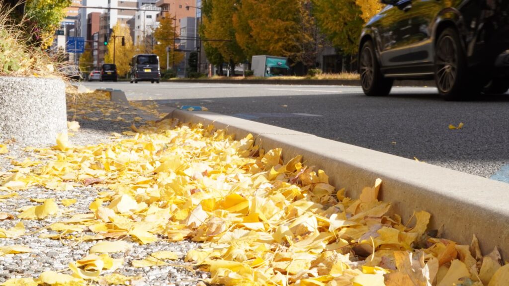 近寄ると臭い銀杏の木だって、あの黄色い葉っぱは写真の差し色にちょうどいい。それに葉っぱが散ってそこら中に落ちているから、木をフレームに入れずともいい写真になる気がします。